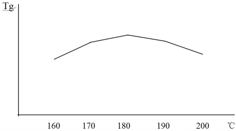 產品層壓時的固化溫度對基板的Tg 影響很大。我們對FR- 4 層壓時的固化溫度與基板的Tg 做了一個對比試驗, 層壓時的固化溫度分別取160℃,170℃,180℃,190℃,200℃, 相同的層壓壓力, 保溫時間都是60min。我們發現基板的Tg 在固化溫度180℃時為最高(見圖67)。溫度低于180℃,由于基板固化不充分,所以其Tg 偏低;溫度高于180℃,樹脂將開始出現降解,溫度越高,降解現象越嚴重,所以其Tg 偏低,基板也開始發黃。